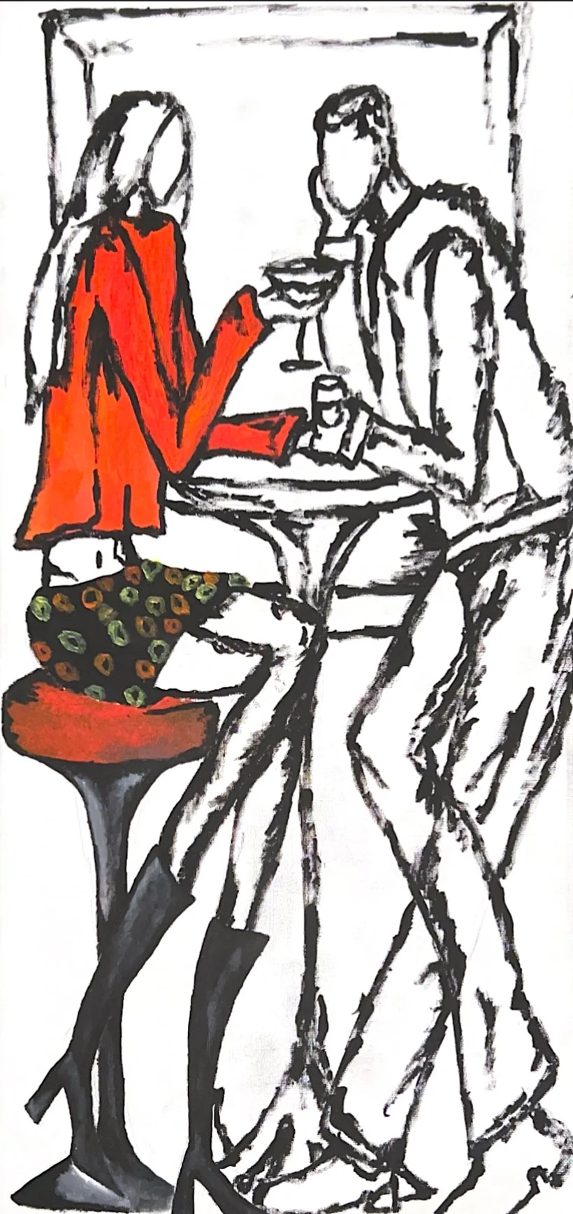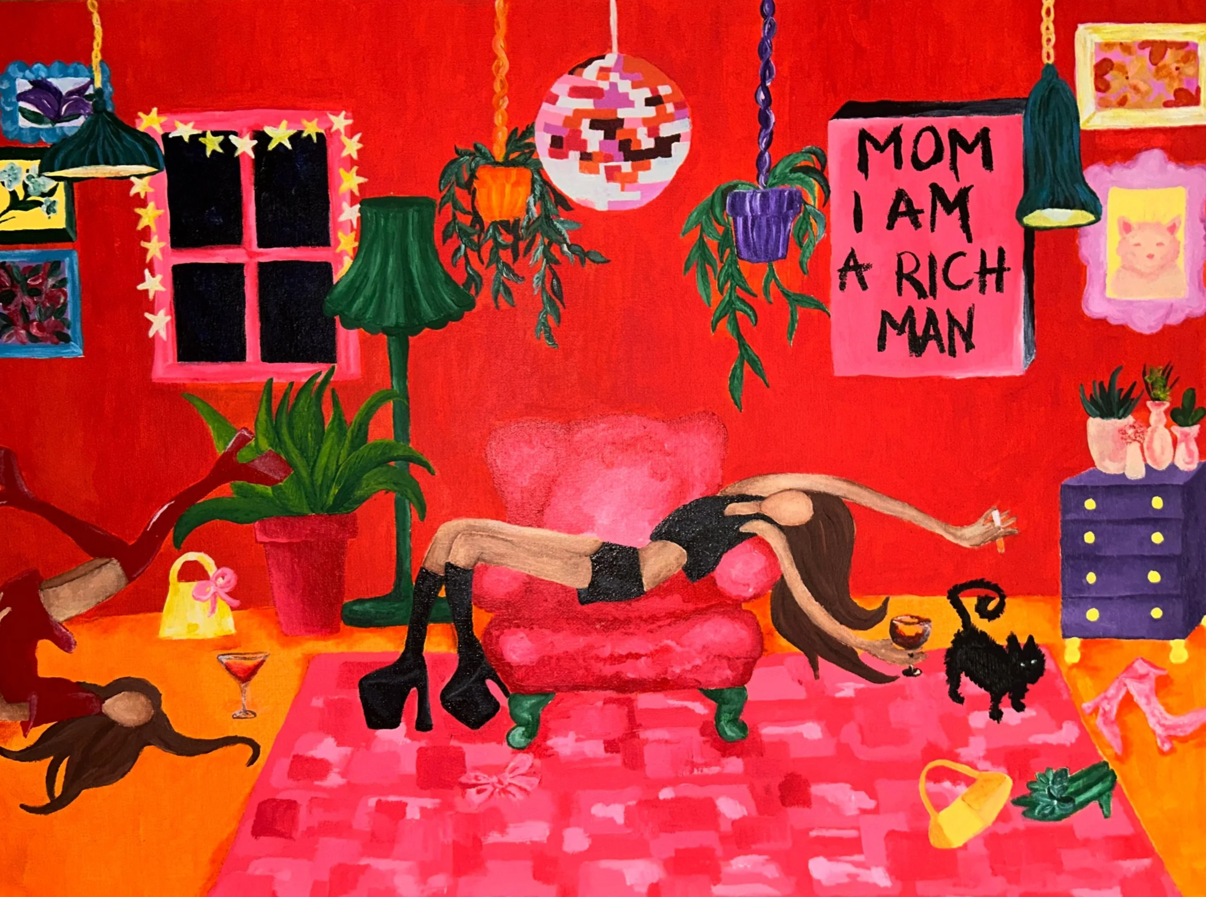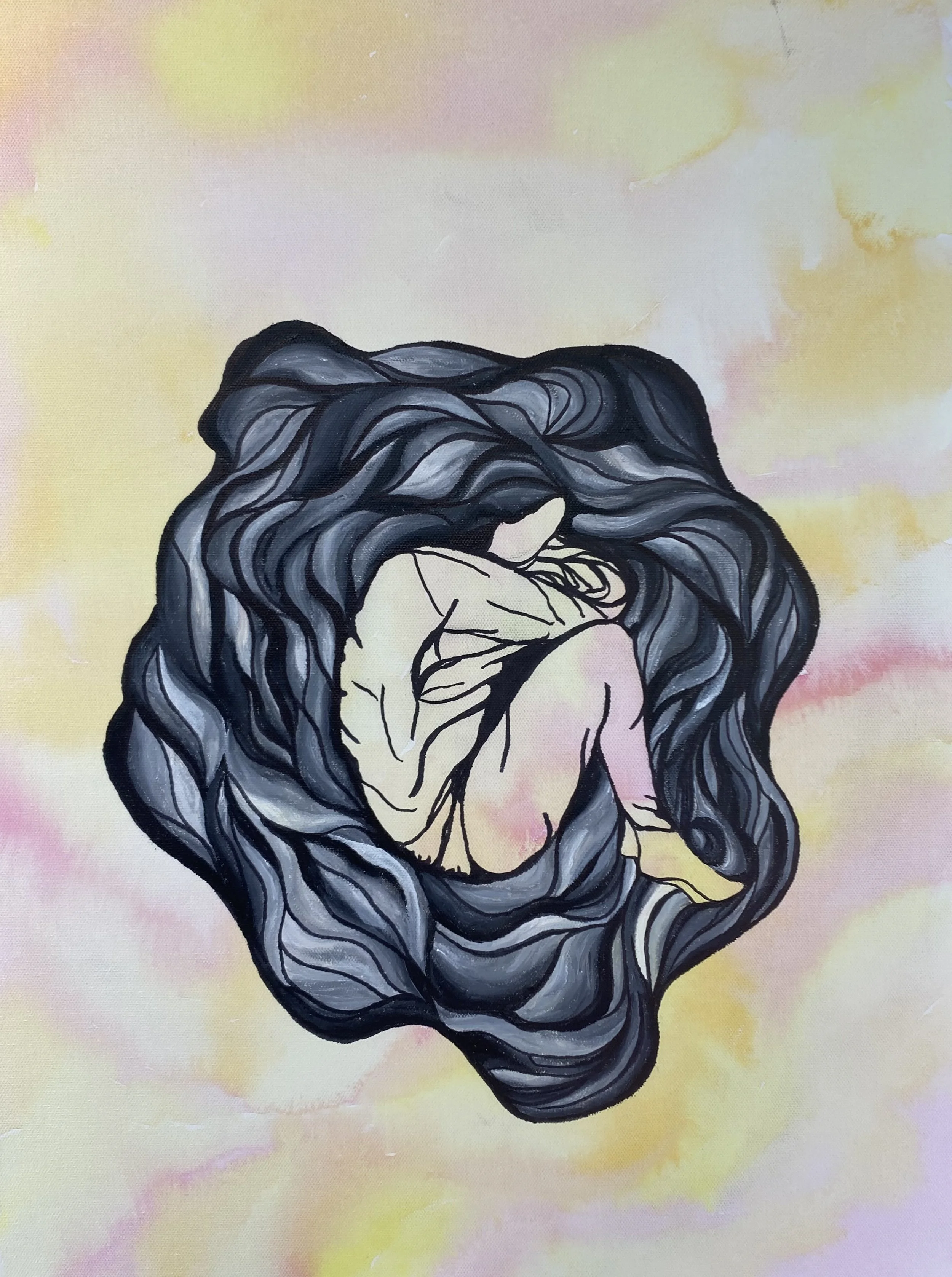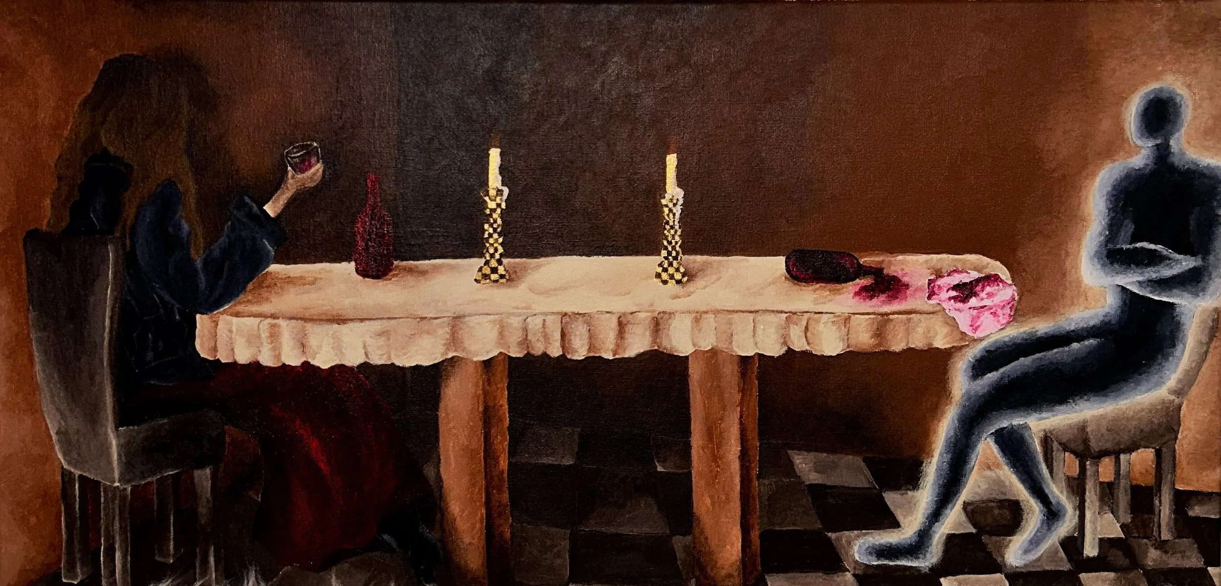 'Champagne Problems’ captures the essence of female friendships entering adulthood, influenced by a quiet moment after a night out with my best friend. The bold, lively colors mark a shift from my usual darker themes, symbolizing a breakthrough- a realization that my art can embrace light, hope, and meaningful moments, not just struggle. This piece is a joyful “aha moment” of growth and new creative horizons.