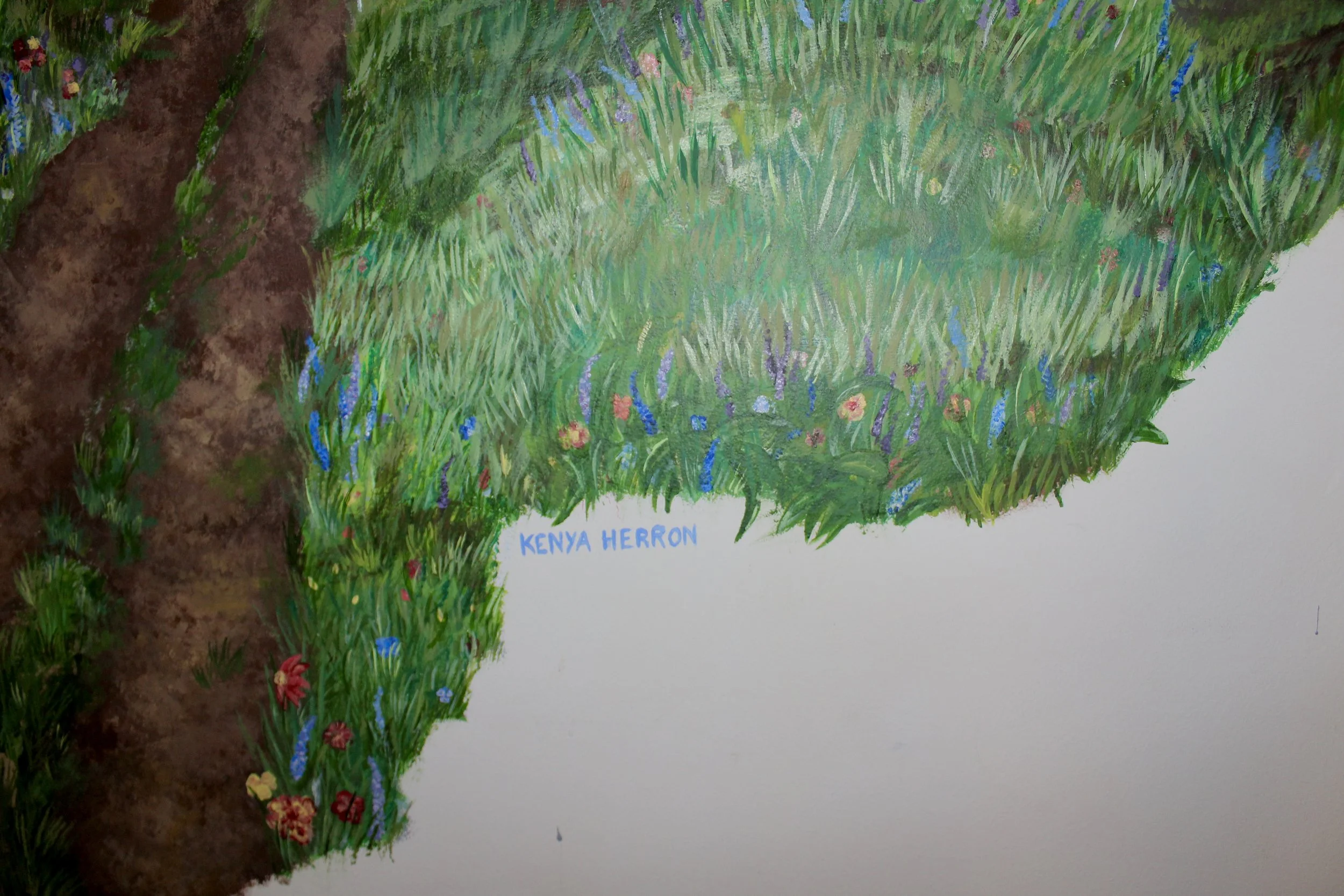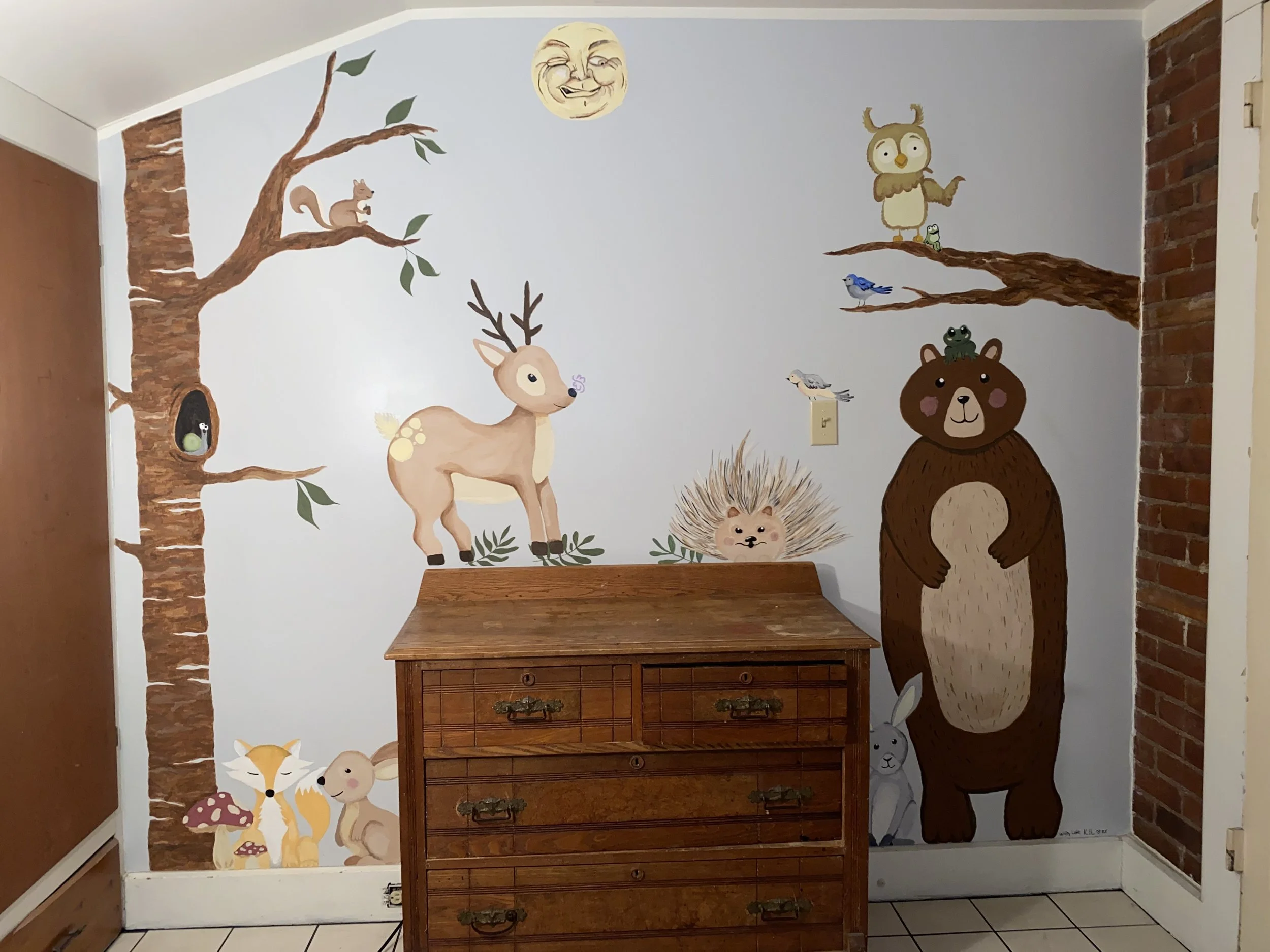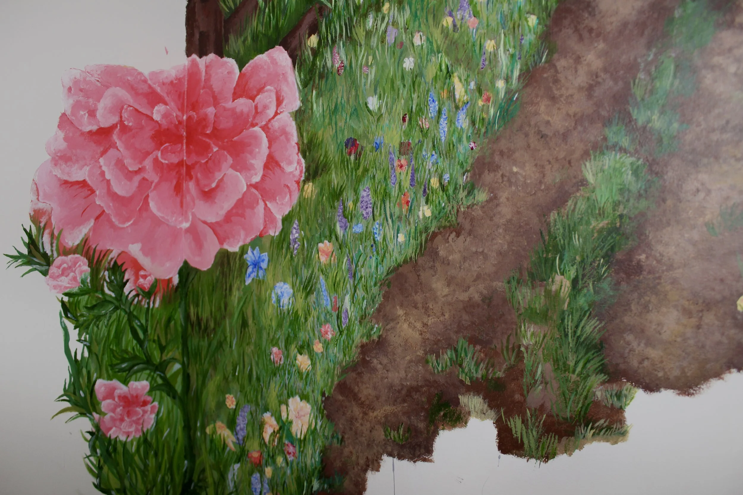 In January of 2025, the owner of an Airbnb on Owasco Lake requested a mural for the entrance of the home. The request was a warm and bright landscape scene representing the Finger Lakes Region, the dirt country roads, wildflowers, and sunshine soaking through the trees right before a storm rolls over the lake.